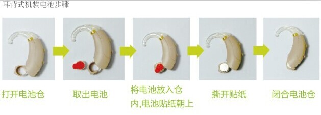 1、当助听器出现低电量提示音时应及时更换新电池,将新电池上的贴片撕下,打开电池仓门,取出废旧电池,将新电池装入电池仓门上,后关好电池仓门(佩戴和操作助听器前,手指要保持清洁、干爽);