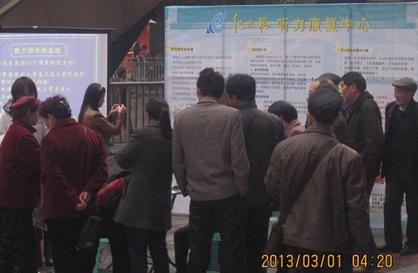 3月1日和3月2日,由亿尔聪听力康复中心的工作人员在沙坪坝三峡广场悬挂横幅,播放“保护听力、听力康复”的视频,发放“爱耳护耳”资料200余份,为现场群众提供电子耳窥镜检查人数达52人,针对听力下降的人群进行了听力康复及助听器验配方面的宣传指导。