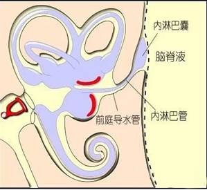 感觉声音的主要结构-内耳,由骨迷路和膜迷路组成,膜迷路内有内淋巴液,内淋巴液的正常代谢对维持正常的听力是密切相关的,前庭导水管将膜迷路与内淋巴囊相连,而正常大小的前庭导水管是维持内淋巴液代谢所须的。由于先天发育异常导致前庭导水管扩大时,内淋巴液可经扩大的前庭导水管从内淋巴囊倒流于耳蜗或前庭,损伤感觉毛细胞出现耳聋或眩晕。