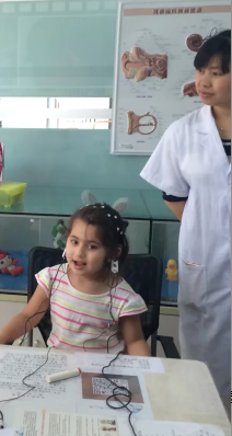 小卡塔克在2岁半时被发现听力障碍,随后检查为双耳重度听力损失,随后在巴基斯坦当地验配了助听器,佩戴助听器后两个月能开口喊爸爸妈妈。一直到要上学的年纪,父亲想给她重新验配一款助听器,因为卡塔克有些发音不是很好,耳模也有些不合适了。2016年5月,我们接到Otcion总部的来电,告知小卡塔克和母亲及弟弟要来探望在渝交流学习的父亲,希望我们亿尔聪能为小卡塔克验配一副新的助听器。