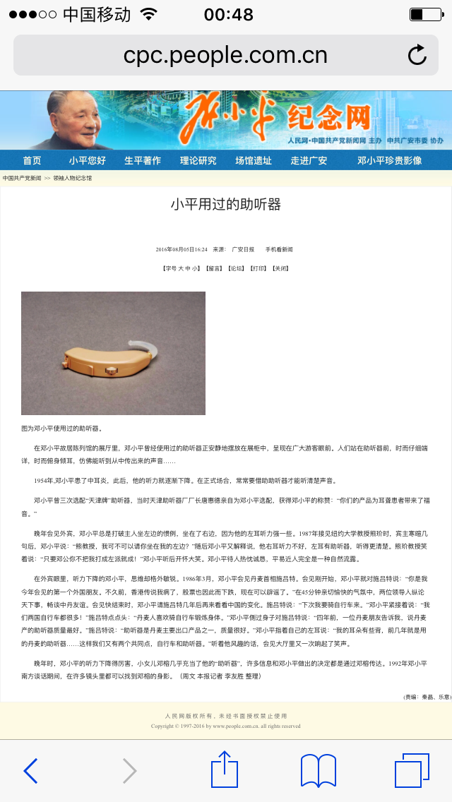 1954年,邓爷爷患了中耳炎,此后,他的听力就逐渐下降。在正式场合,常常要借助助听器才能听清楚声音。