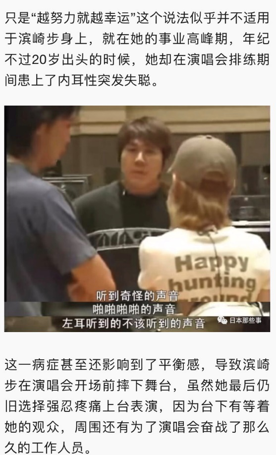 日本歌姬滨崎步因早年不注意保护听力而长期暴露在大功率的音响下,经详细的耳科检查,也被医生证实左耳完全失去听觉功能。