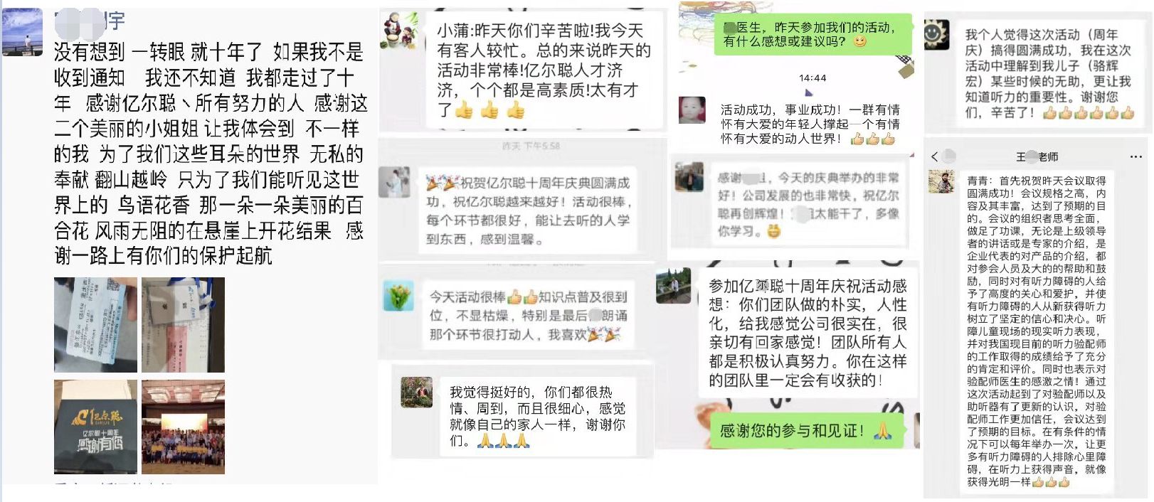 2009,一列通往未来的列车启动了, 2019,亿尔聪安全有序积极健康的运行了十年,走进亿尔聪的人们都这样描述:亿尔聪人像自己的家人一样/一群有情怀有大爱的年轻人撑起了一个有情怀有大爱的动人世界/亿尔聪很实在,人性化,很亲切,有回家的感觉/人才济济,个个都是高素质/通过参加这次活动,理解到我儿子(备注:图片中的小朋友)有些时候的无助,让我真切的懂得了听力的重要性,谢谢你们,辛苦了/通过活动看到亿尔聪员工高昂的工作热情和她们的成长……