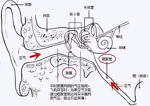 五官是相通的,咽鼓管是中耳和外界相通的唯一管道,中耳腔通过咽鼓管通往鼻咽部的咽鼓管口与外界相通;因此鼓膜两侧都可以接受到空气压力,一是外耳道的空气传到鼓膜外侧,二是空气通过咽鼓管进入中耳腔传到鼓膜内侧,保持内外压平衡。
