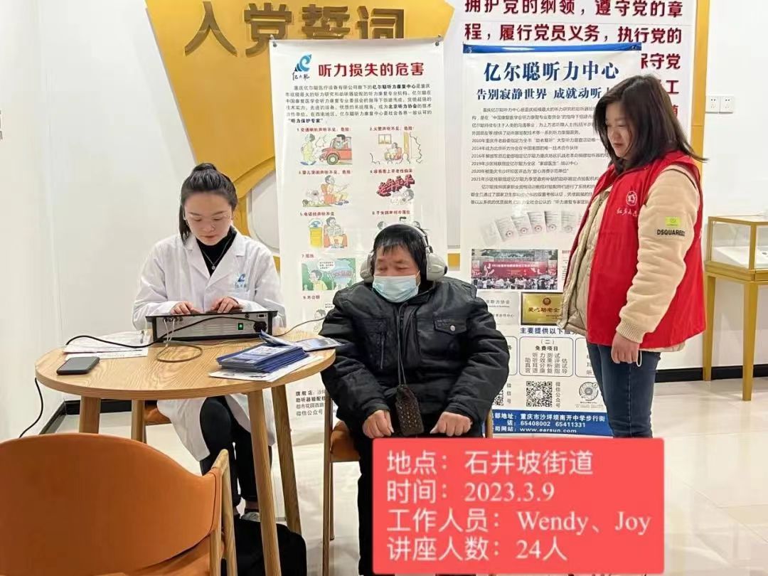 三月,在开展爱耳主题系列活动中,亿尔聪的验配师Joy、Wendy、Lisa、Susie、Ella、Eric、Jenny怀着满满的爱,风雨无阻深入社区来到街头,为居民们解惑答疑,科普听力保健常识,普查听力。在听力科普宣讲过程中,我们看到仍然有很多人从未关注过听力健康,其中也有高校老师,虽然每年都有做身体体检,但却从未检查过听力,也不了解如何保护听力,甚至在听力出现问题时并不清楚该怎么康复。